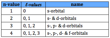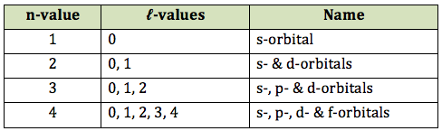 - When n = 4, ℓ-values range from 0 to 3, therefore the n = 4 shell can have s-, p-, d- and f-orbitals