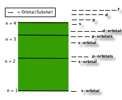 In the diagram below, we can see that n relates to a shell, inside which orbitals (also known as subshells) can be found. Within a given shell, multiple orbitals can exist. The higher the value of n, the greater the number of orbitals. In fact there is a formula to determine how many orbitals exist within a shell: n2, and since we know each orbital can only hold 2 electrons, every shell can hold 2n2 electrons