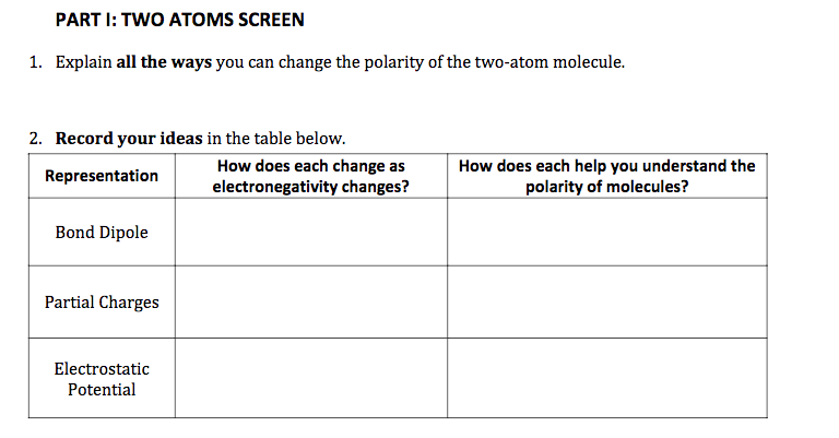 Using the Two-Atoms Screen Tab answer the following, click here to open the questions in a document that you can save.