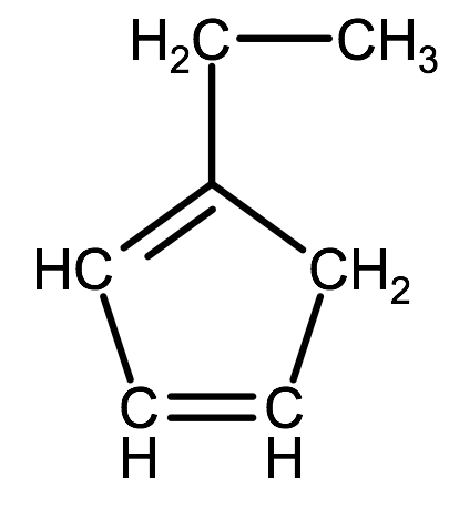For cyclic alkenes and alkynes we follow the same convention as for alkanes. For the organic compound below, the IUPAC name would be 1-ethyl-1,3-cyclopentadiene
