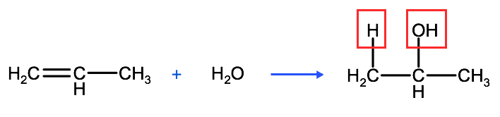 We saw in the previous learning activity, that alcohols are the product of hydration reactions involving alkenes. These reactions follow Markovnikov's rule, whereby the hydrogen atom is added to the carbon with the most hydrogen atoms bound to it before the reaction began. For example, 2-propanol (and not 1-propanol) is formed by the addition reaction of 1-propene with a water molecule because of Markovnikov's rule.