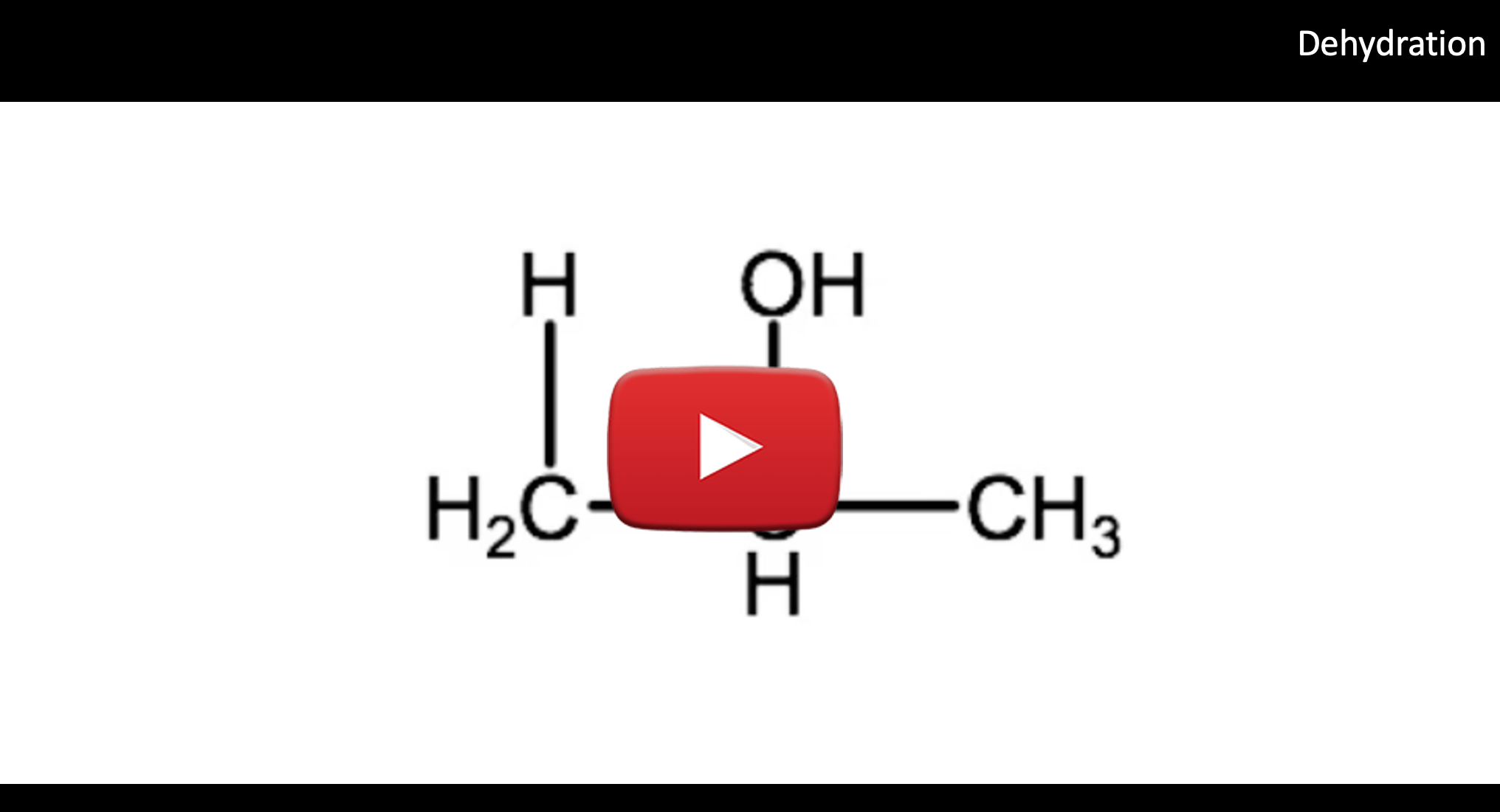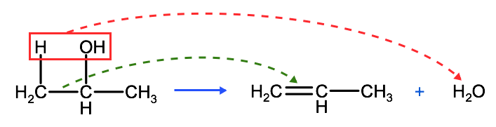 An elimination reaction is one in which two substituents are removed from a molecule, and in organic chemistry this is typically accompanied by the formation of a double bond. One such elimination reaction that occurs with alcohols is called dehyration which is the reverse of a hydration reaction. In a dehydration reaction a hydrogen and hydroxyl group are removed from a reactant molecule, leading to the formation of a double bond. A water molecule is also formed as one of the products. Dehydration reactions require the presence of a catalyst to proceed, in this case an acid. The removal of both H and -OH creates a double bond between the carbons that were initially bound to the H and the -OH. Another way to think of a dehydration reaction is that a water molecule is removed from a reactant molecule, or the reactant molecule is de-hydrated. Dehydration reactions require acid to act as a catalyst to push these reactions forward. In the dehydration reaction below, we have the opposite of the reaction we just saw above. In our dehydration reaction we have 2-propanol undergoing a reaction to form 1-propene and water. Note the appearance of the double bond between carbon 1 and carbon 2.