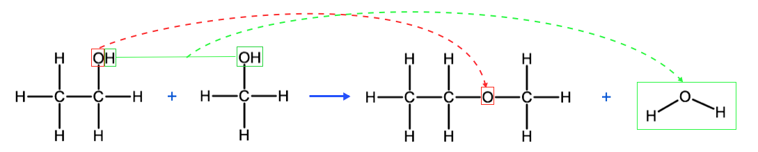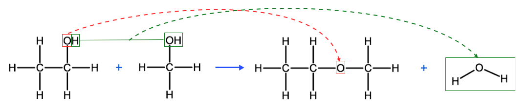 A condensation reaction is one in which two molecules react with each other to produce one large molecule and one water molecule. These are similar to a dehydration reaction, in which one of the products is a water molecule, but remember, in a dehydration reaction, there was only one reactant, whereas in a condensation reaction we have two reactants. We previously learned that ethers are similar to alcohols in that they contain oxygen atoms that are single-bonded to carbon atoms, the difference being that in ethers, the oxygen atom is bound between 2 carbon atoms. To produce ethers, we need two alcohol molecules to react in a condensation reaction, producing an ether and a water molecule. For example, below we see the condensation reaction between ethanol and methanol to produce methoxyethane and water.
