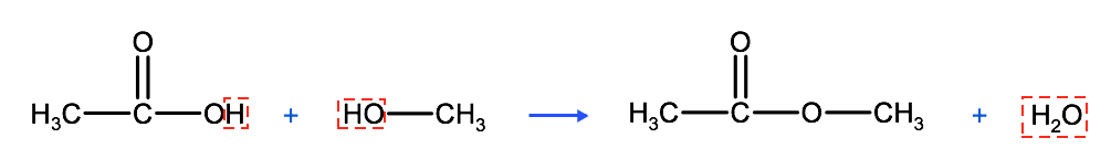 a condensation reaction between a carboxylic acid and an alcohol, producing an ester and water. Below we see an esterification reaction between ethanoic acid and 3-methylbutanol which produces the ester: 3-methylbutyl ethanoate