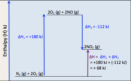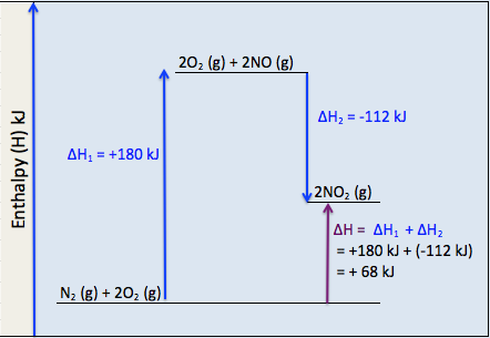 If you add these two reaction equations, of the elementary steps, together, you get the overall reaction equation for the formation of nitrogen dioxide, which has the same ΔH value as the one step process.