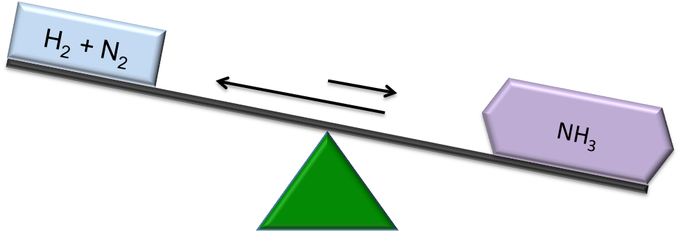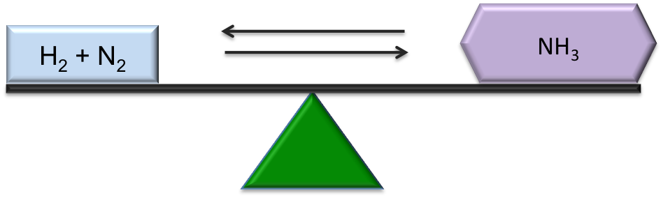 The forward reaction occurs when H2 and N2 combine to form ammonia (NH3), the reverse reaction occurs when NH3 dissociates into N2 and H2. When the hydrogen and nitrogen are first added, there is no ammonia present. Initially, the rate of the forward reaction is very fast and the rate of the reverse reaction is zero. Over time, as the two reactants react, their concentration goes down and at the same time the concentration of NH3 increases. As the concentration of NH3 builds up, the reverse reaction begins to occur, whereby the NH3 decomposes into H2 and N2. As more and more NH3 decomposes, its concentration goes down and, the forward reaction begins occuring again. There comes a point where the forward and reverse reactions occur at the same rate and the concentration of the products and reactants remains stable. This is the point of dyanamic equilibrium.