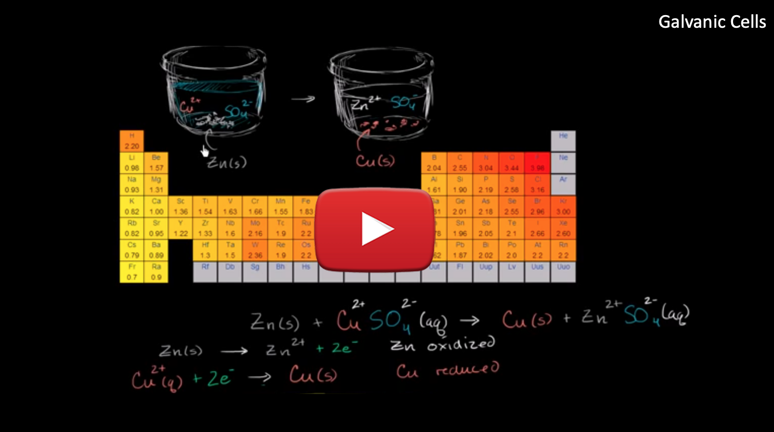 Zn(s) + Cu2+ (aq) --> Zn2+ (aq) + Cu(s)