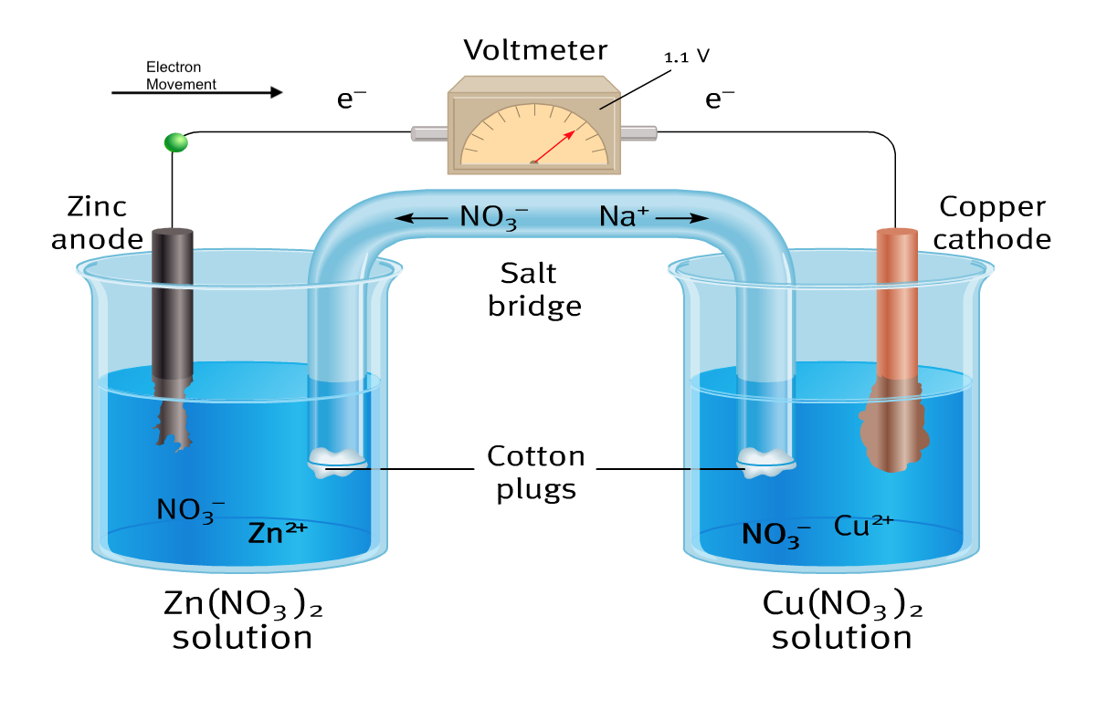 Picture yourself using a battery powered device, a flashlight for example. When the switch is off, no light shines yet by simply flipping that switch, electricity starts flowing, and enough power is generated to produce light. The production of this electricity occurs in the batteries, which take advantage of the properties of redox reactions to generate the power needed. The production and transmission of electricity, or electrical power requires the movement of electrons. As we have learned in this unit already, redox reactions involve the transfer of electrons between species. By isolating paired oxidation and reduction reactions in a setup called a galvanic cell, scientists are able to harness the transfer of electrons in redox reactions to create electrical power. In the following video, you will learn how galvanic cells work and the important components of a galvanic cell. Watch the full video and then use the navigation buttons to explore all of the important components of a galvanic cell. Below the video, you will learn a method to represent galvanic cells using a simplified format known as line notation.