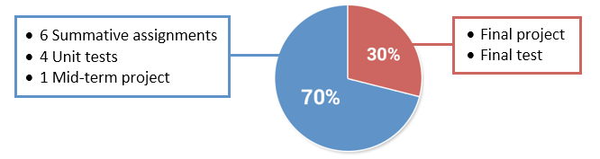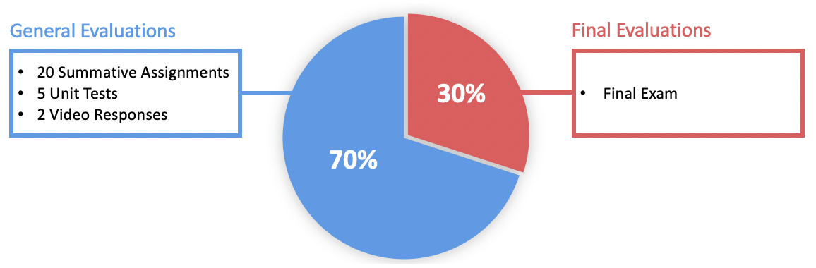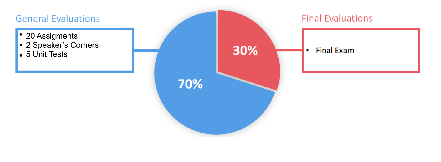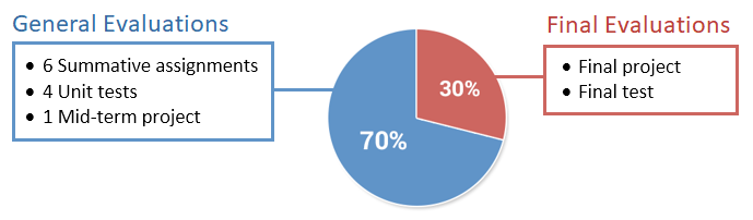 Grade Distribution The grade for this course is divided into two main parts: 70% for General Evaluations and 30% for Final Evaluations.