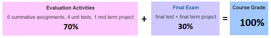 This course is built with a number of formative tasks (check-up time activities) and summative assignments to develop your learning skills and to help you achieve high academic success on formal evaluations that decide your final grade. Formative tasks in each lesson demonstrate to you and your teacher how well you have understood the learning goals for the lesson. Completing formative tasks and summative assignments are critical to your learning. Students must complete all evaluation activities in each lesson in order to complete the unit tests and final examination. |
