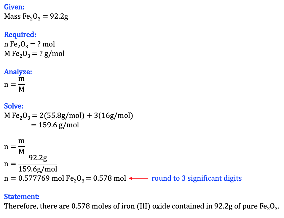 When iron is exposed to air, it corrodes to form red-brown rust. Rust is iron (III) oxide (Fe2O3). How many moles of iron (III) oxide are contained in 92.2g of pure Fe2O3? Round your final answer to three
